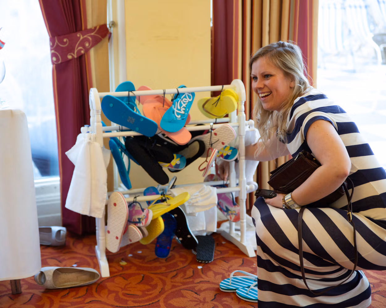 By the time we arrived back inside, the room had shifted again. Some bridesmaids were happily worn out, resting — or fast asleep — in quiet corners, while others were full of energy, laughter breaking out over flip-flops and well-earned comfort after a long day.