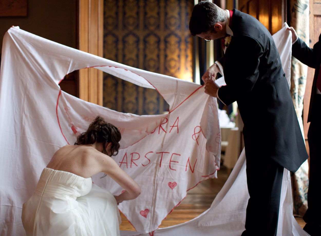 Back in the grand hall, laughter and love filled the air. Family and friends gathered to share gifts and smiles, while a charming German tradition brought playful joy — Alexandra and Carsten cutting their heart-shaped sheet together, laughter rising as they worked side by side.