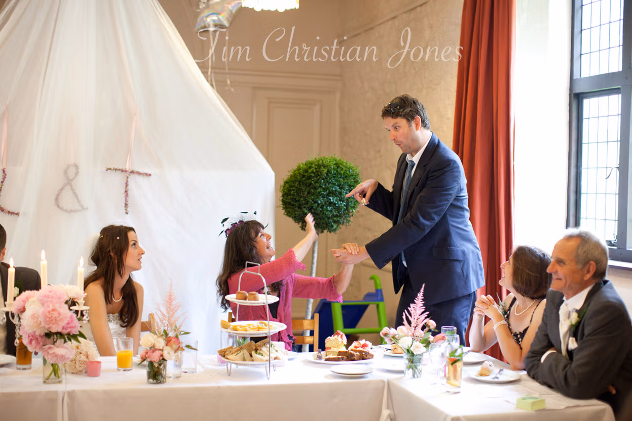 The wedding breakfast was a charming afternoon tea, complete with fruit scones, cream and jam, and simple rose vases on the tables. Lowri and Tim entered to warm applause, and I did what I love most — capturing the fun, the emotion, and the joy as it naturally unfolded.