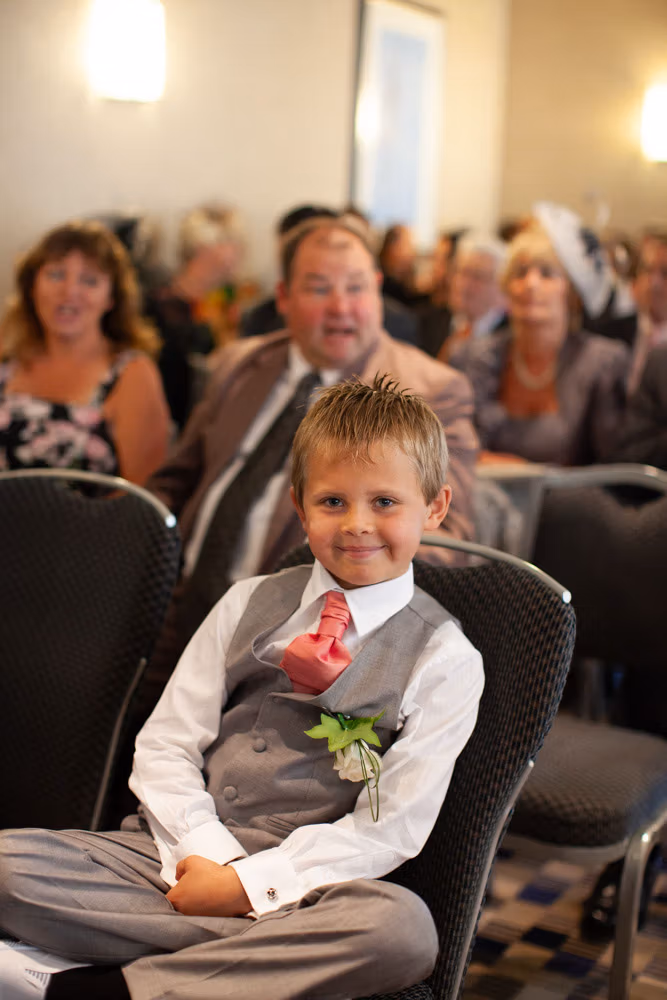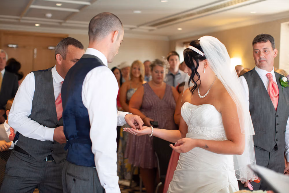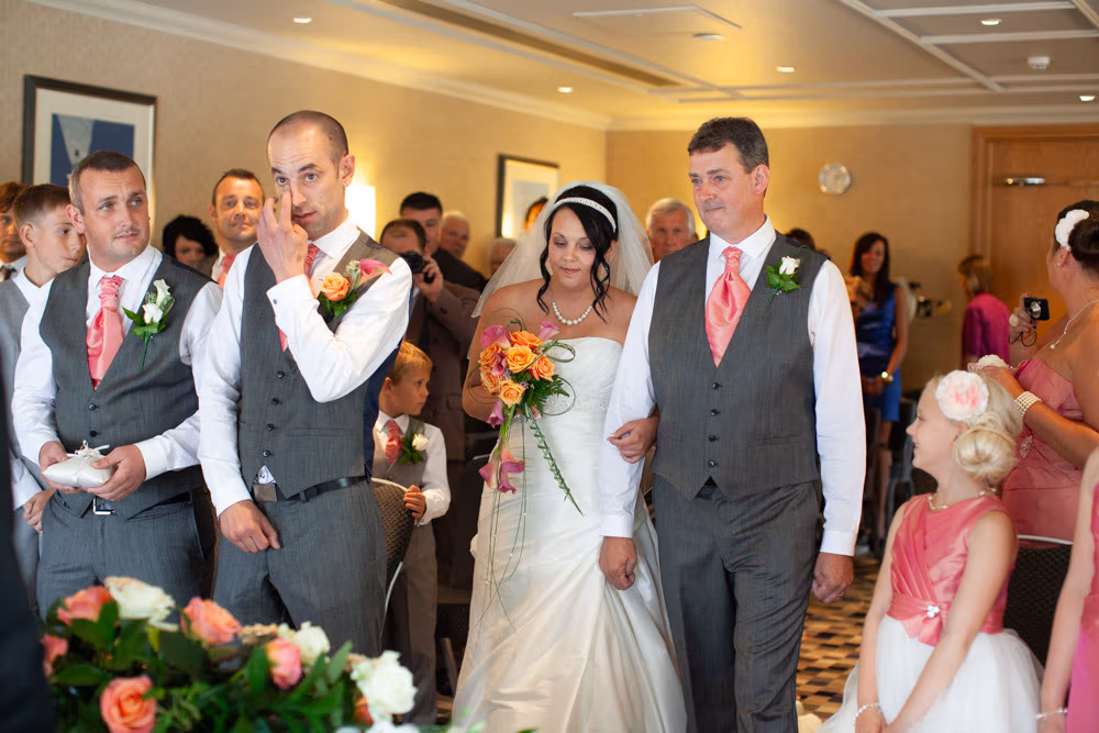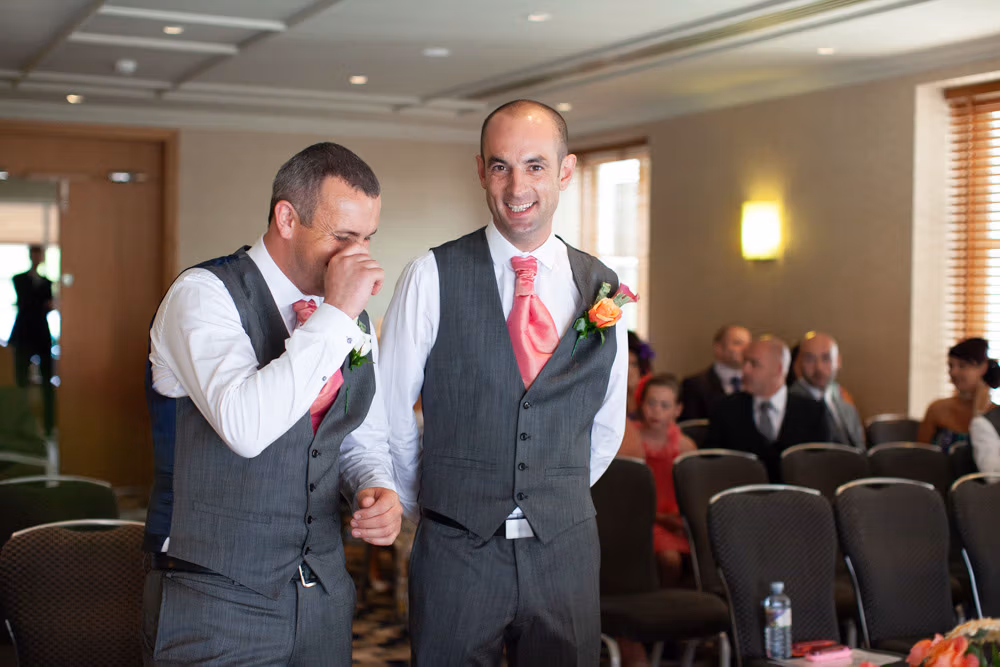 The ceremony room was filled with anticipation and quiet excitement. The groomsmen, dressed in sharp grey suits and bright white shoes, shared easy laughs that helped break the tension. Standing alongside his best man, Dave tried to keep calm, but his eyes said it all.