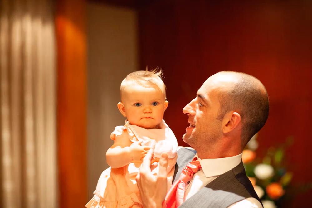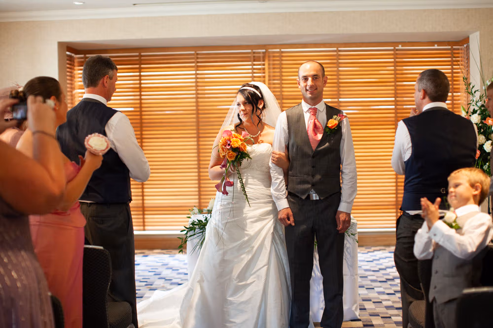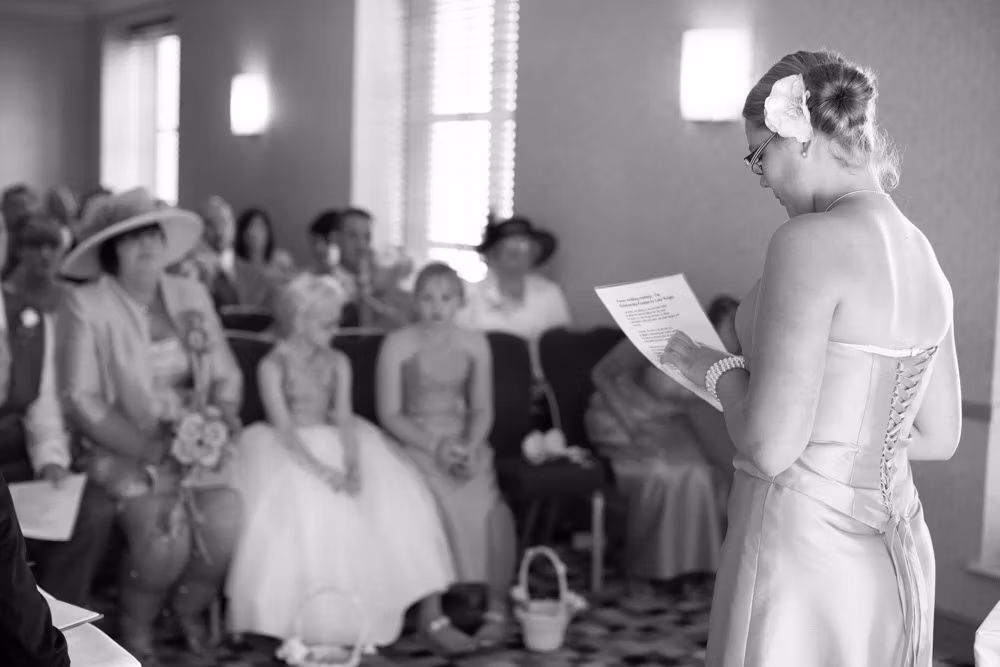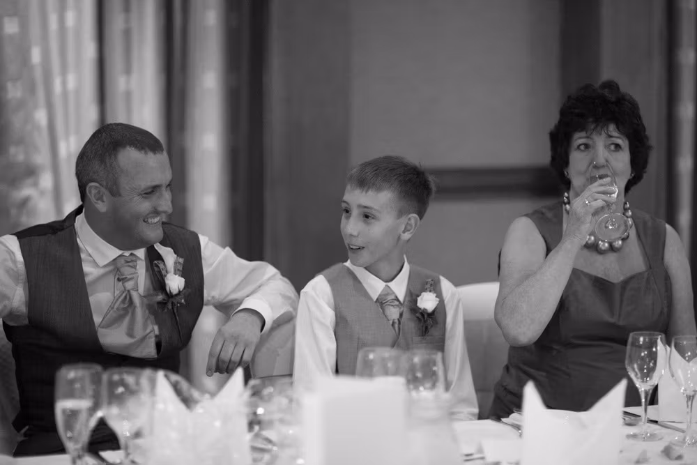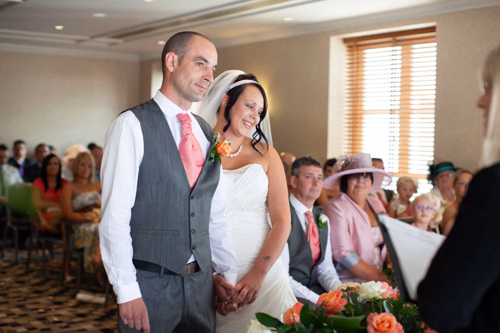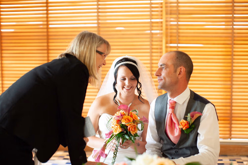 With the blinds half open, a soft, misty light filled the room as Gemma and Dave signed the register. Family and friends leaned in close, smiling, snapping photos, and soaking up the happiness of the moment. Their children joined them too, making the family portraits at this stage extra special — full of hugs, laughter, and pride.