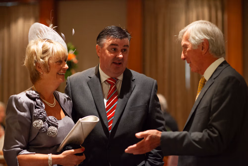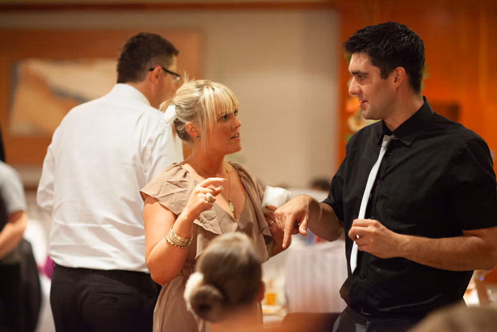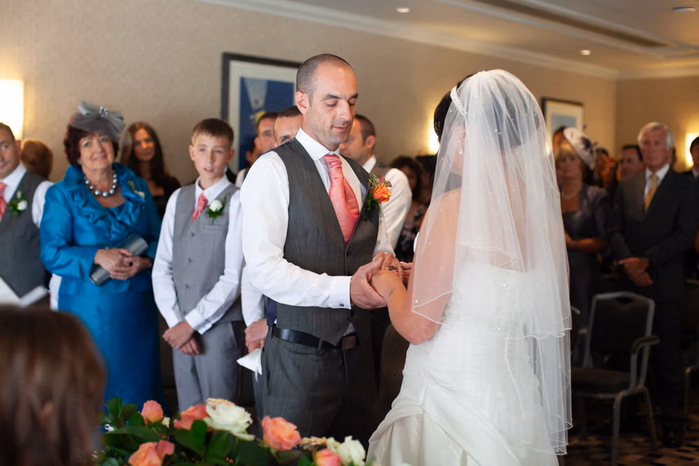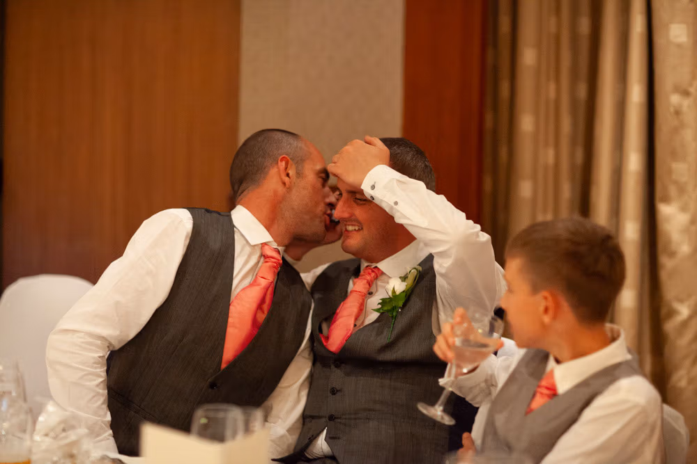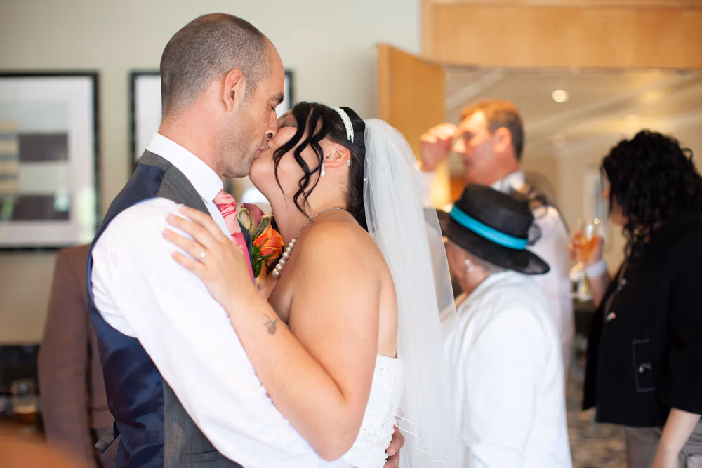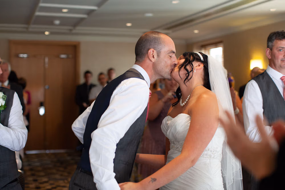 Once the register was signed, everyone flowed into the adjoining room — a space alive with chatter, smiles, and that first wave of post-ceremony relief. I caught Gemma and Dave sharing a quiet kiss in the middle of it all, a little pause just for them.