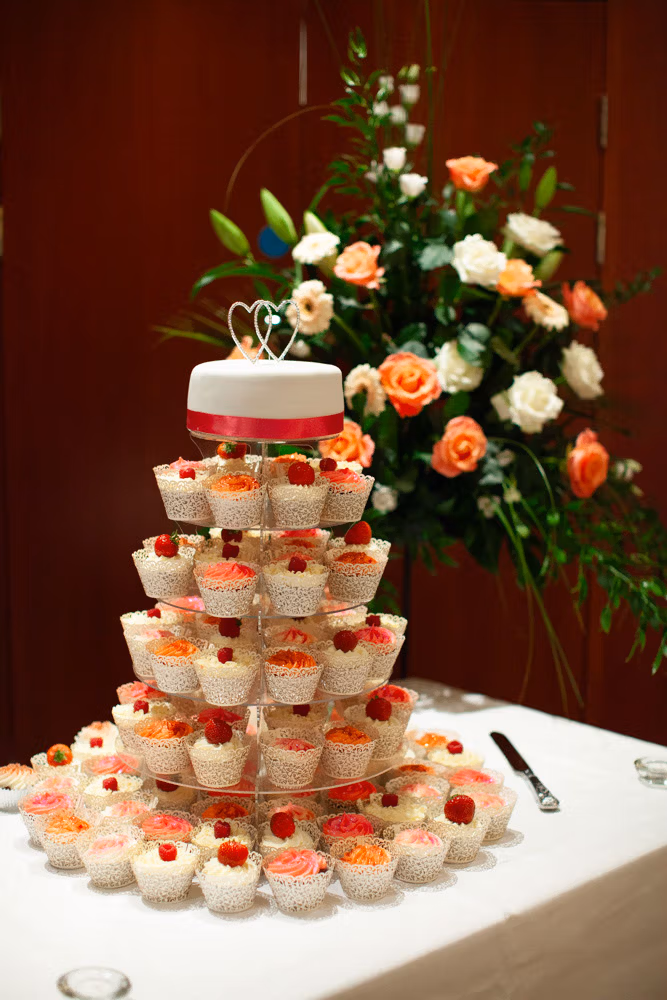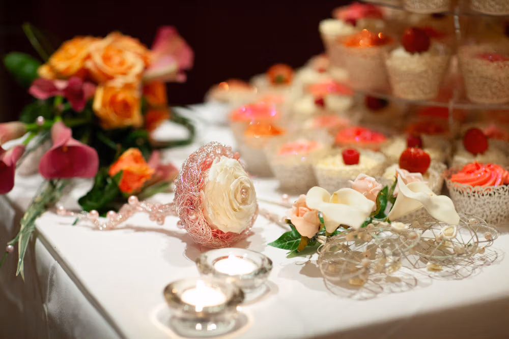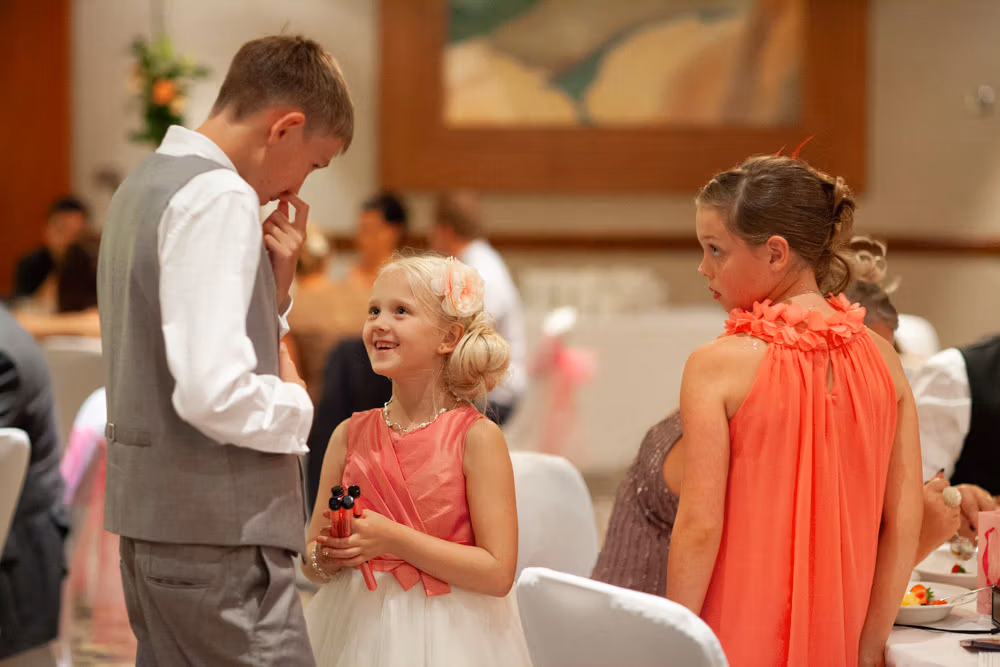 The wedding breakfast began with thoughtful little details — table settings, cake decorations, and a sweet moment as their daughter carefully buckled her shoes. Guests chatted warmly while the room filled with laughter and energy.