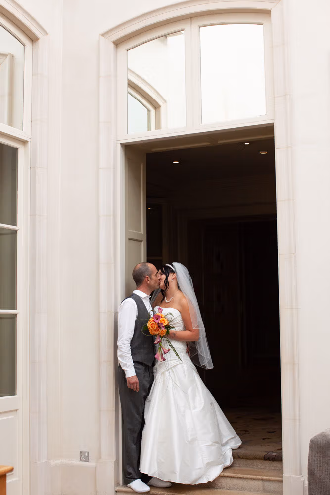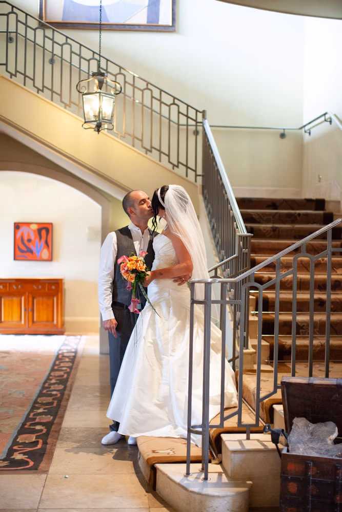 Before the evening truly began, we stepped aside for a handful of portraits. At the foot of the grand staircase, framed by the tall doorway, and finally outside in the welcome return of the sun — each shot felt full of ease and connection.