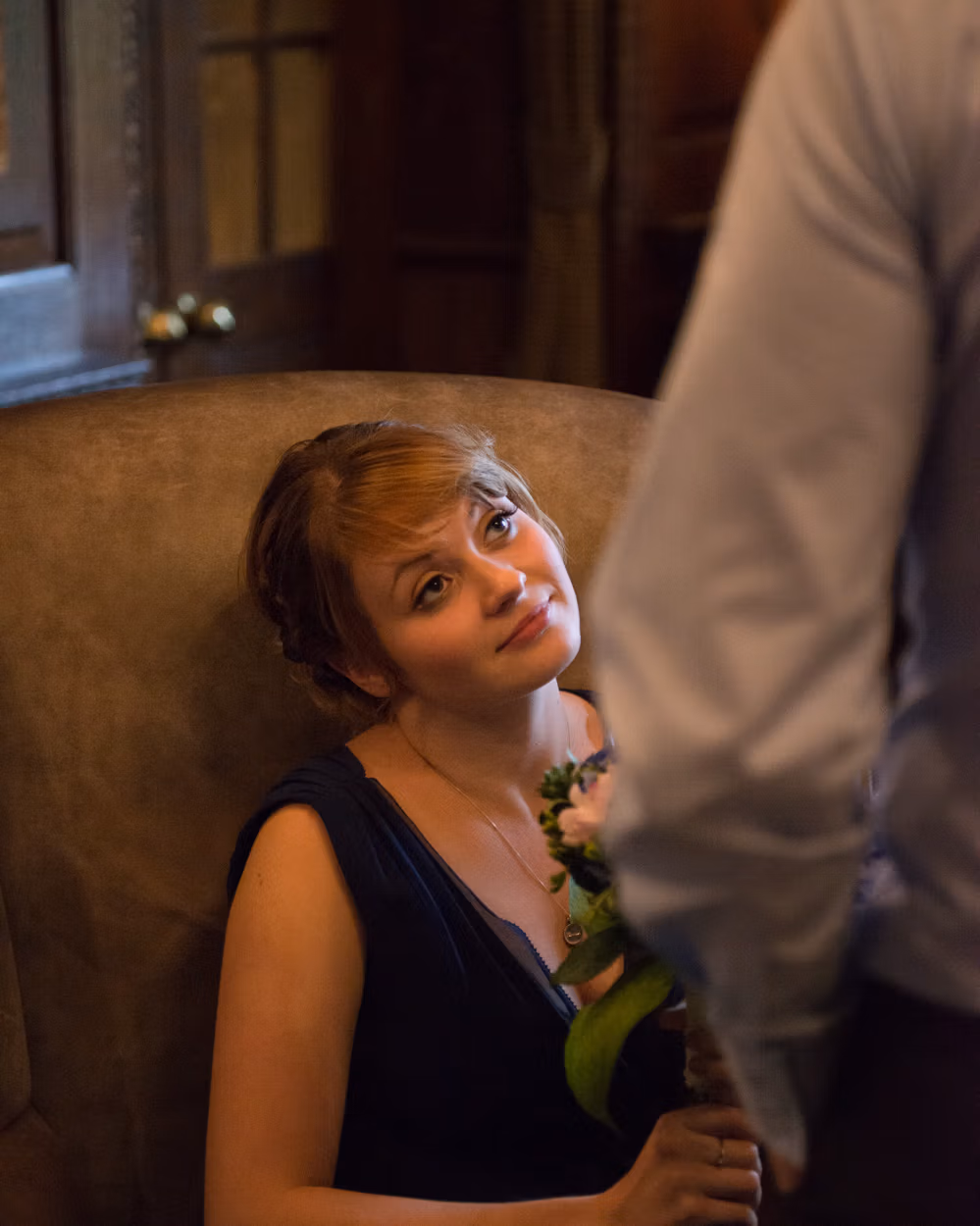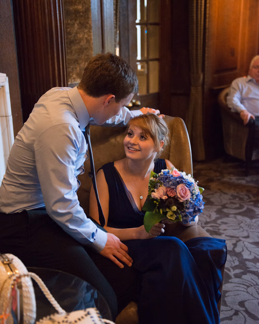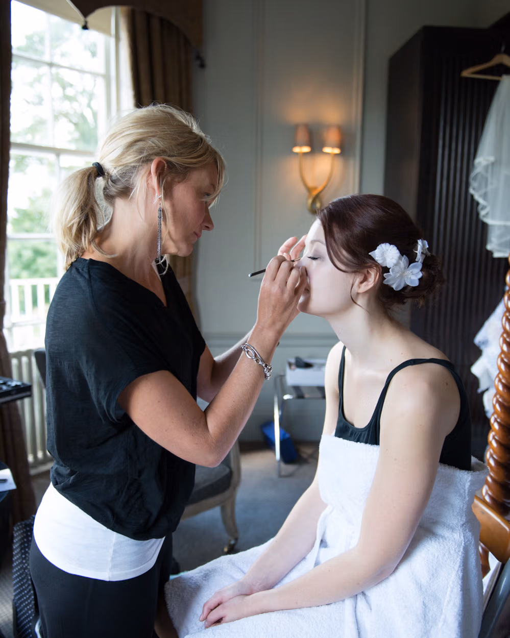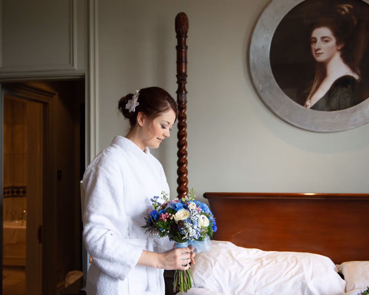 I arrived as Tanya was having her make-up done, the room calm and quietly expectant. A blue and white bouquet rested nearby, and her dress hung gently against a painting above the four-poster bed — everything waiting for the journey to Kirk Deighton.