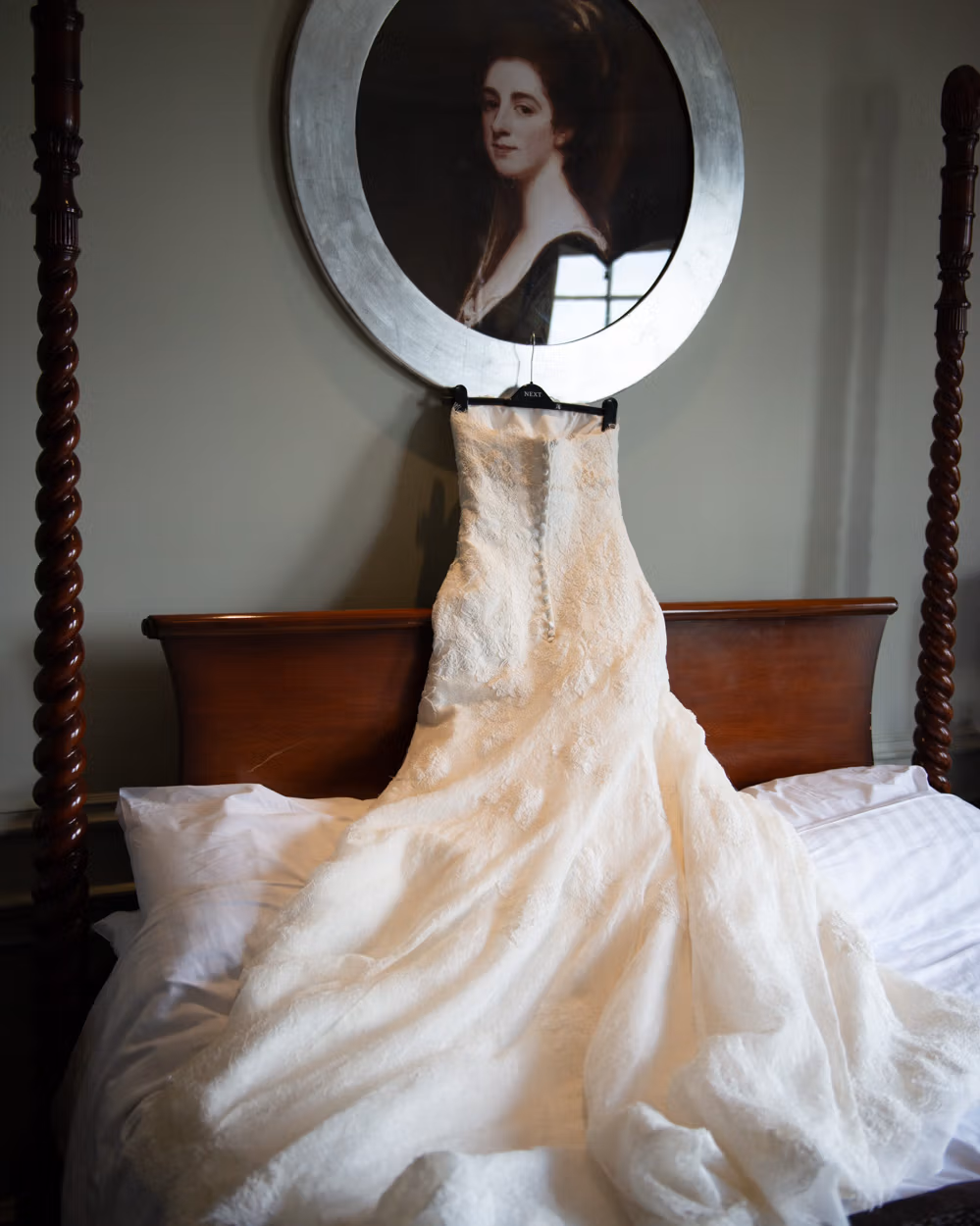 Her dress hung from a picture frame beside the four-poster bed, the veil catching the light as it moved slightly in the air. A blue and white bouquet rested nearby, waiting for the next part of the day to begin.