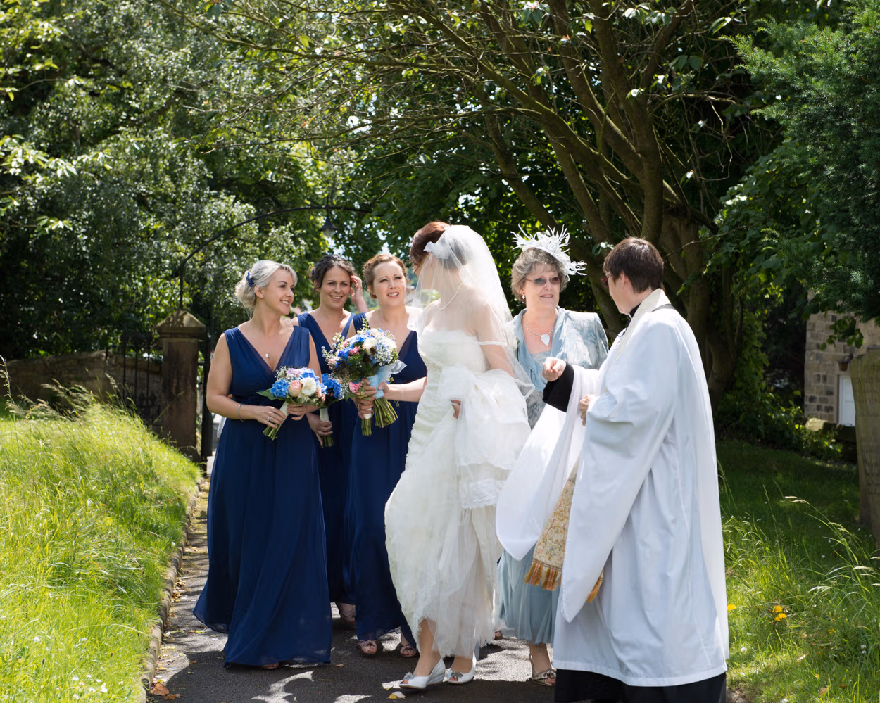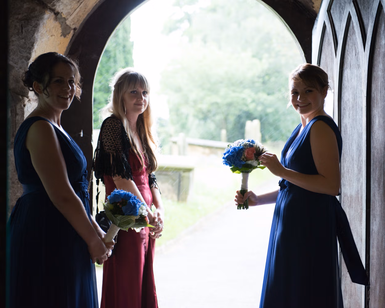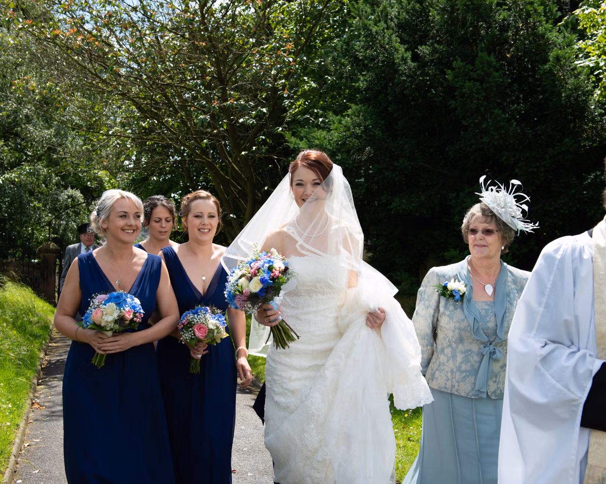 Then, just as the clouds began to lift, a vintage white Rolls pulled up. Tanya stepped out smiling, joining her bridesmaids as they walked together towards the church, the light softening around them.