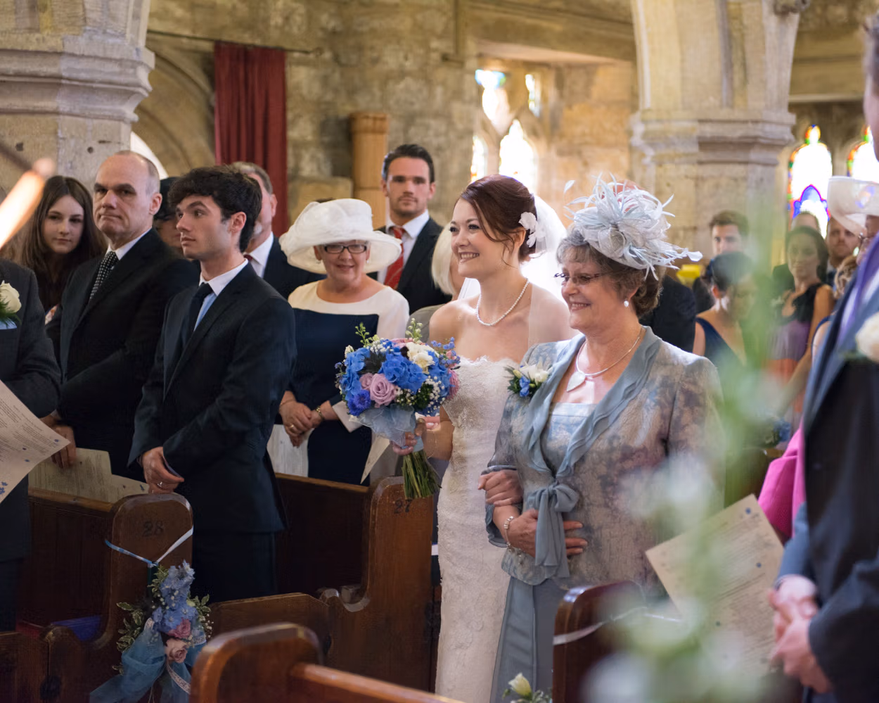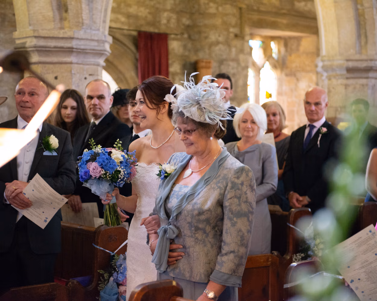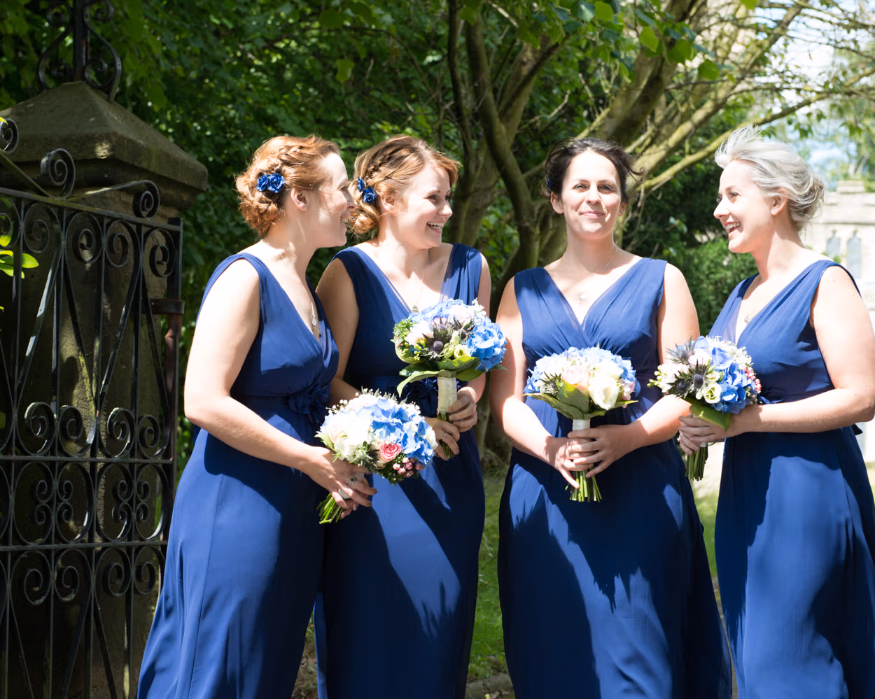 Then, just as the clouds began to lift, a vintage white Rolls pulled up. Tanya stepped out smiling, joining her bridesmaids as they walked together towards the church, the light softening around them.