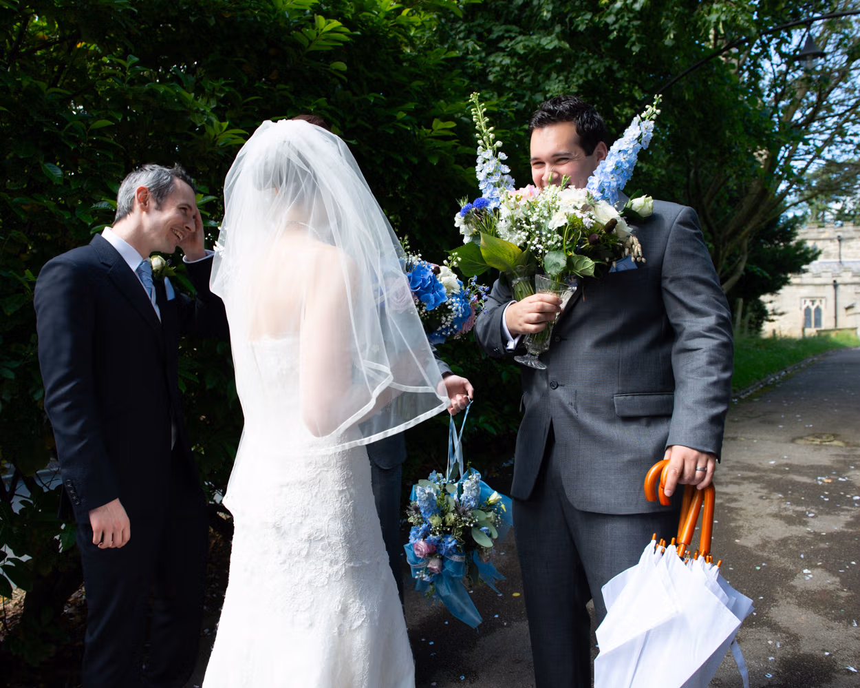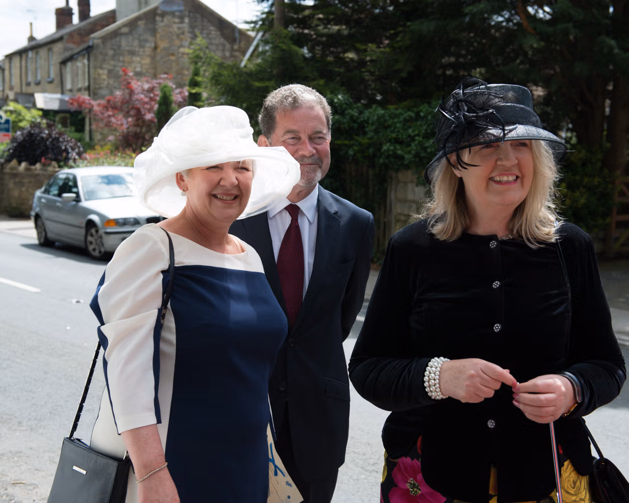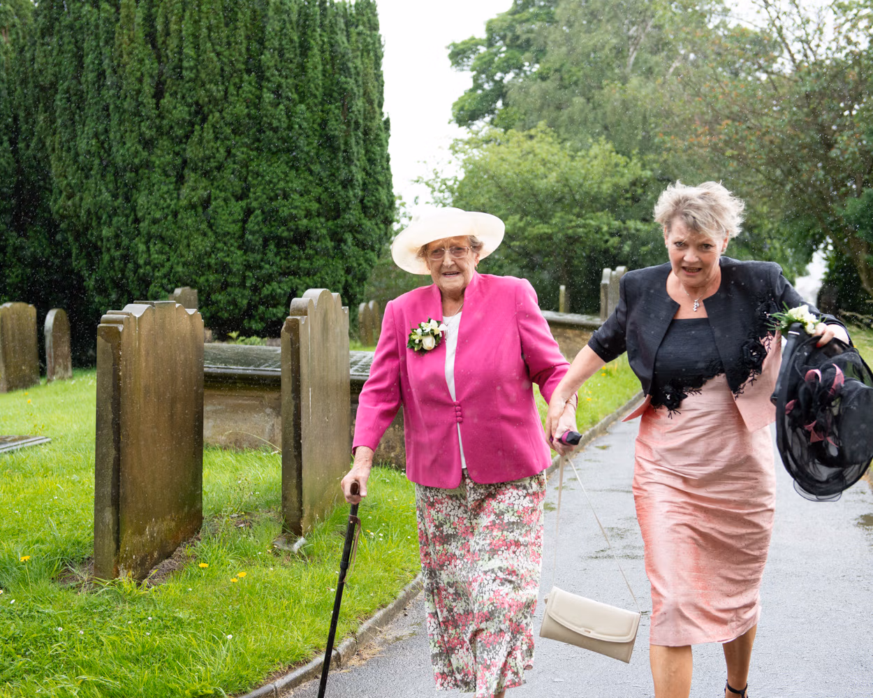 The morning moved between rain and sunshine as guests gathered at Kirk Deighton, some sheltering quietly beneath umbrellas, others arriving through the shifting light along the pathway.