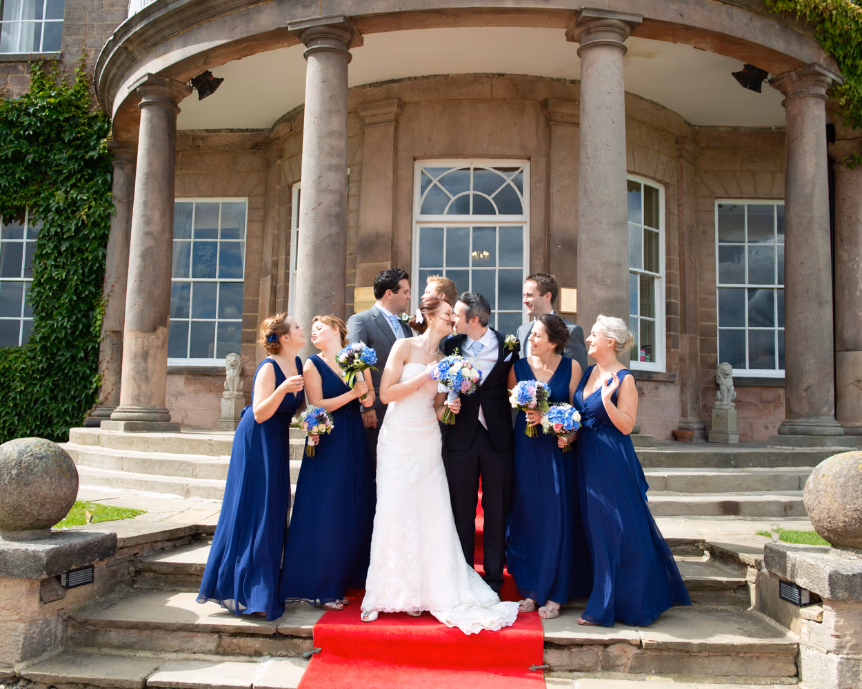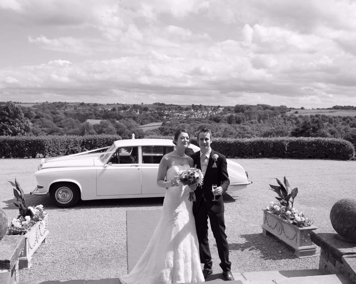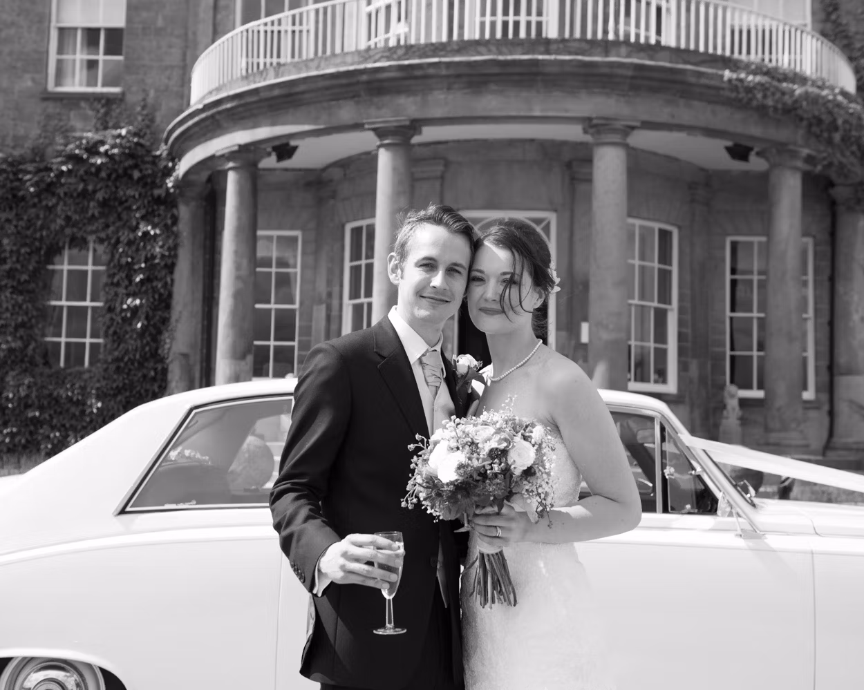 By the time we arrived, the light had shifted again. Sunshine returned as they stepped out beside the vintage Rolls, the hall behind them, guests beginning to gather on the steps. Laughter carried through a handful of portraits before everyone moved inside, the day settling gently into the next part of the celebration.