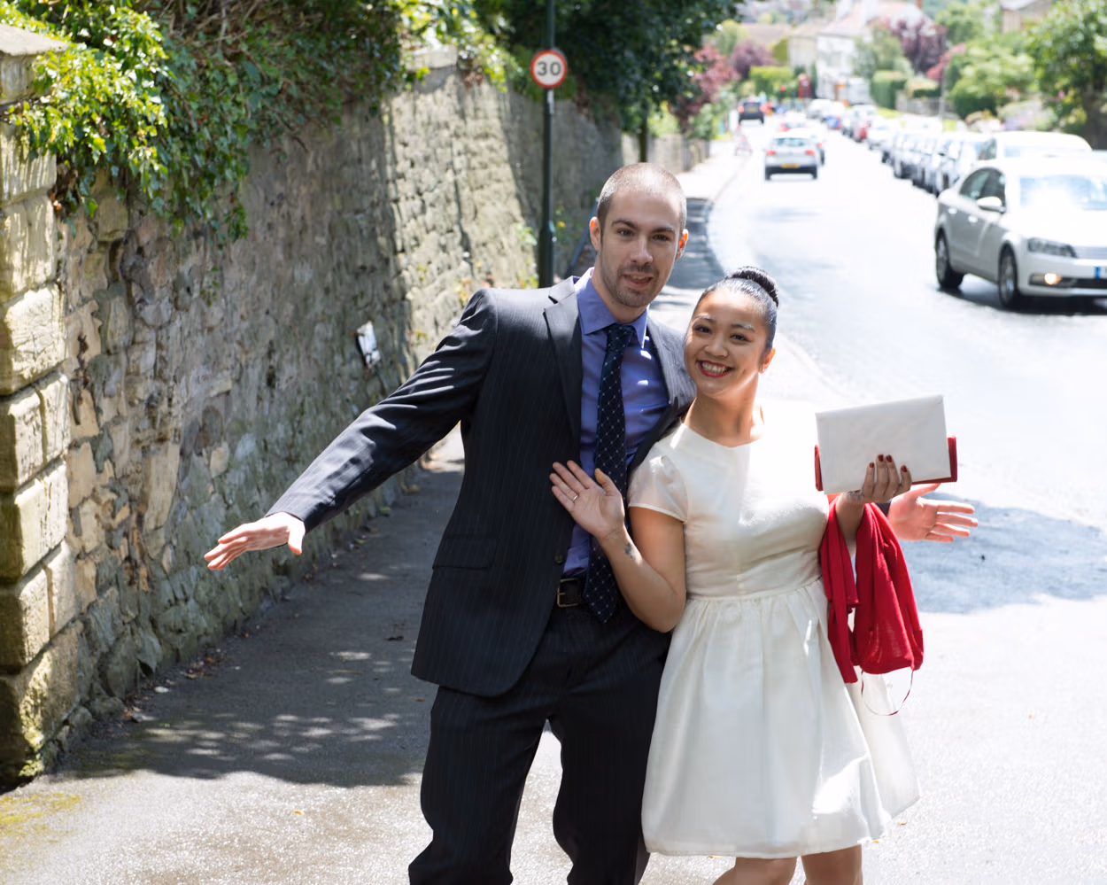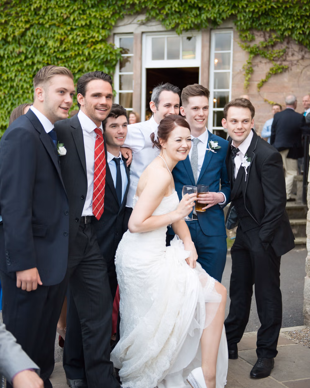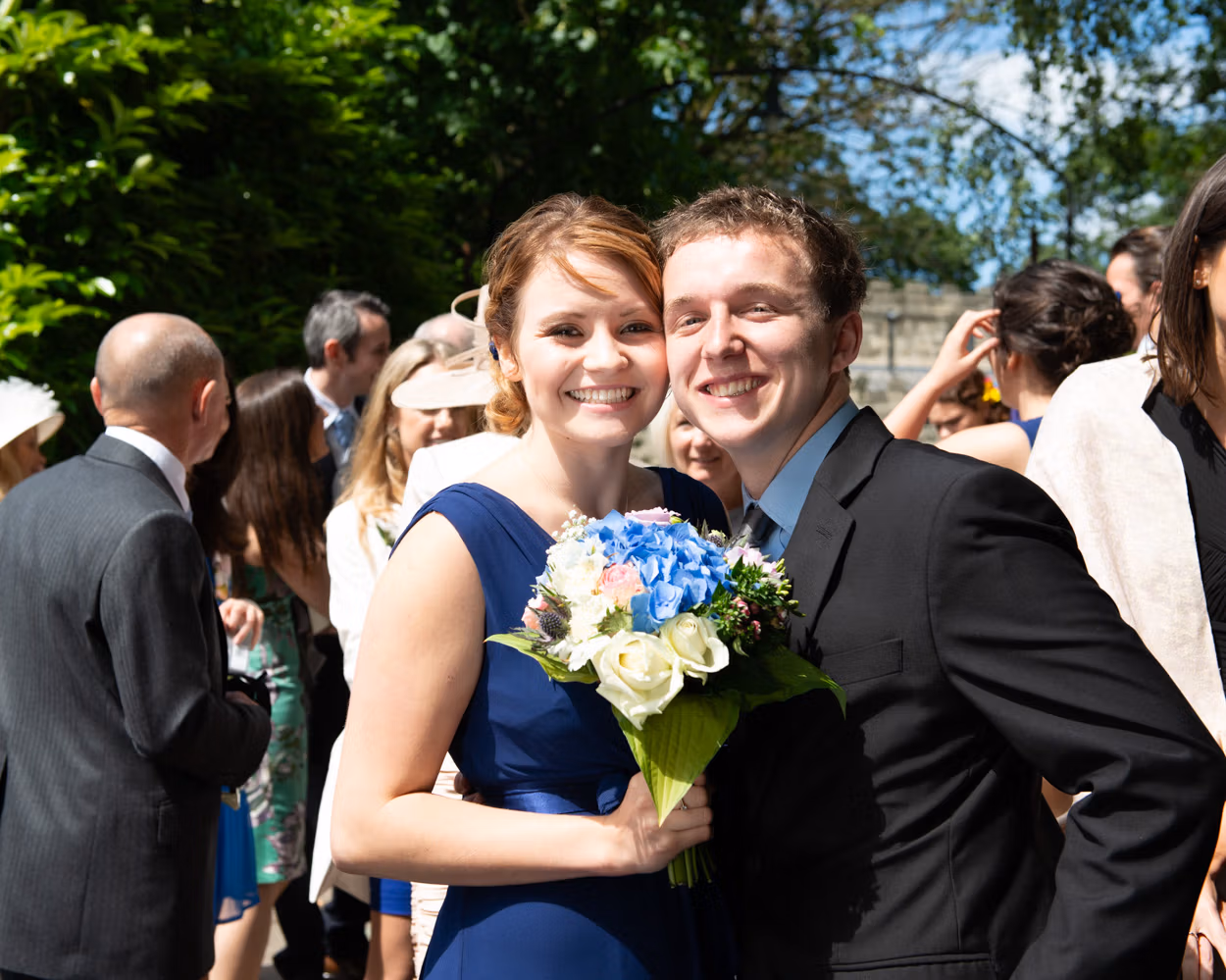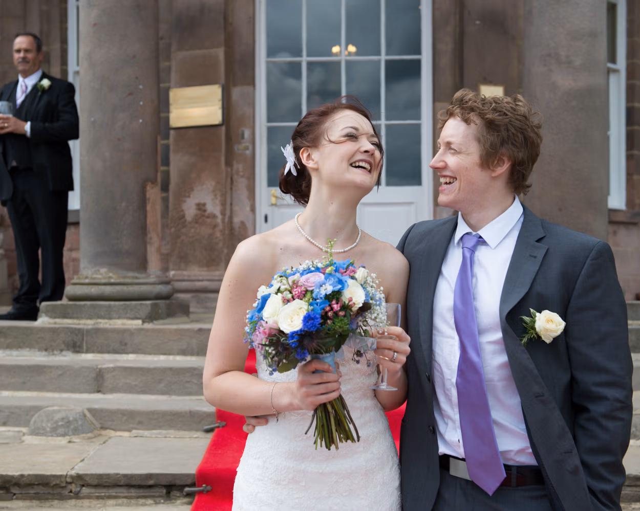 By the time we arrived, the light had shifted again. Sunshine returned as they stepped out beside the vintage Rolls, the hall behind them, guests beginning to gather on the steps. Laughter carried through a handful of portraits before everyone moved inside, the day settling gently into the next part of the celebration.