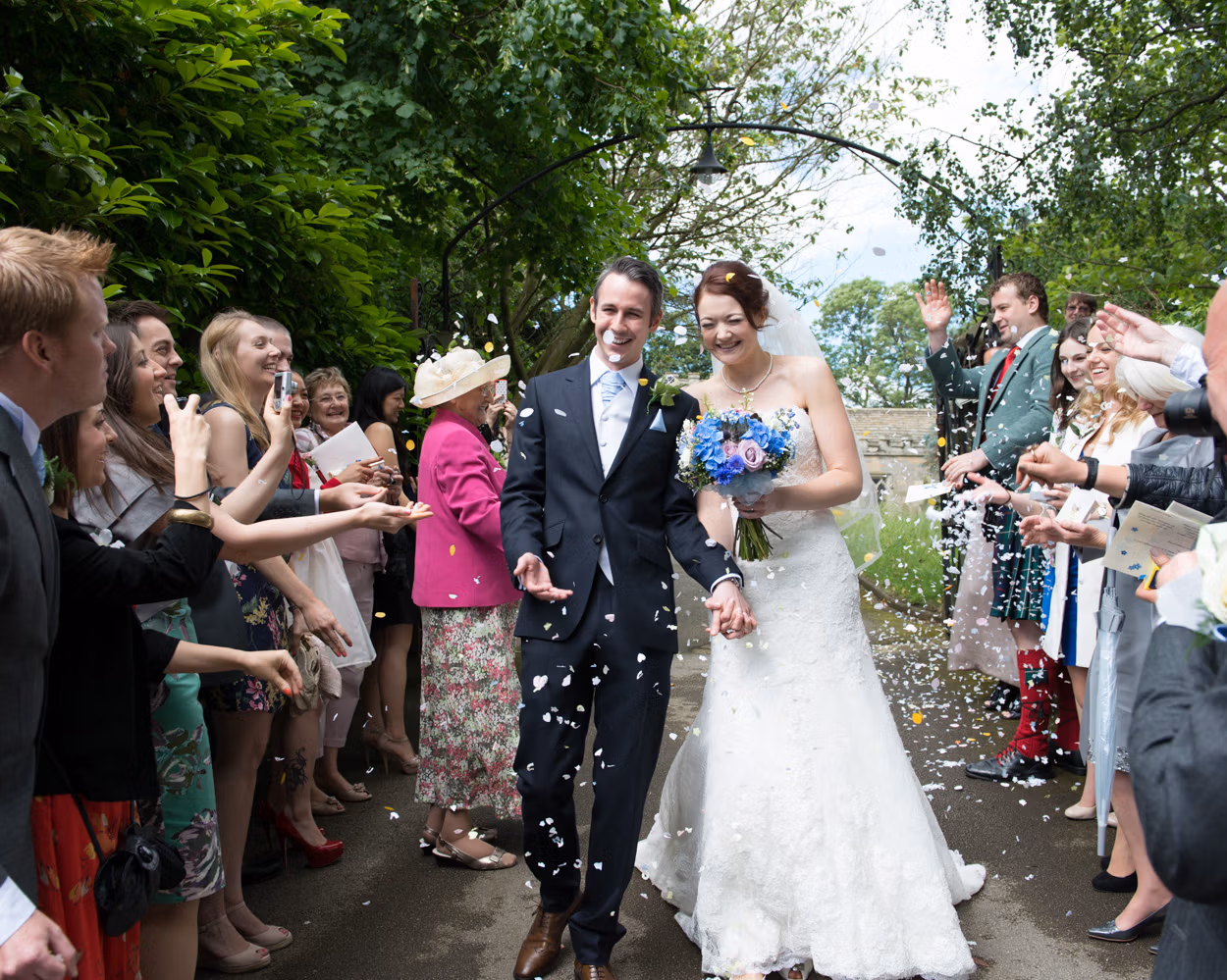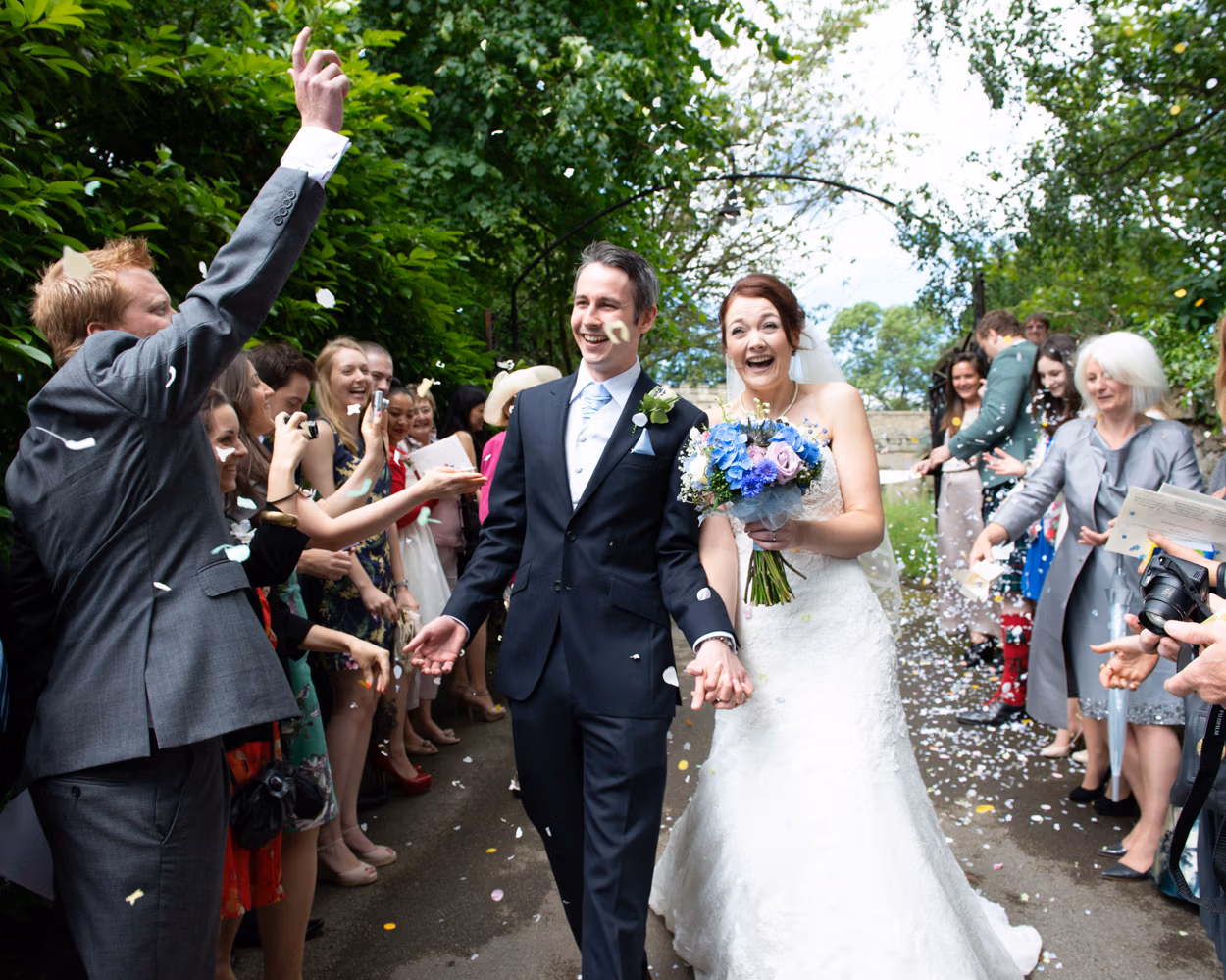 Outside the church, guests gathered in two lines, confetti held ready as anticipation quietly built. Tanya and Paul stepped through a soft burst of colour, smiles all around them, the moment unfolding easily among friends and family.