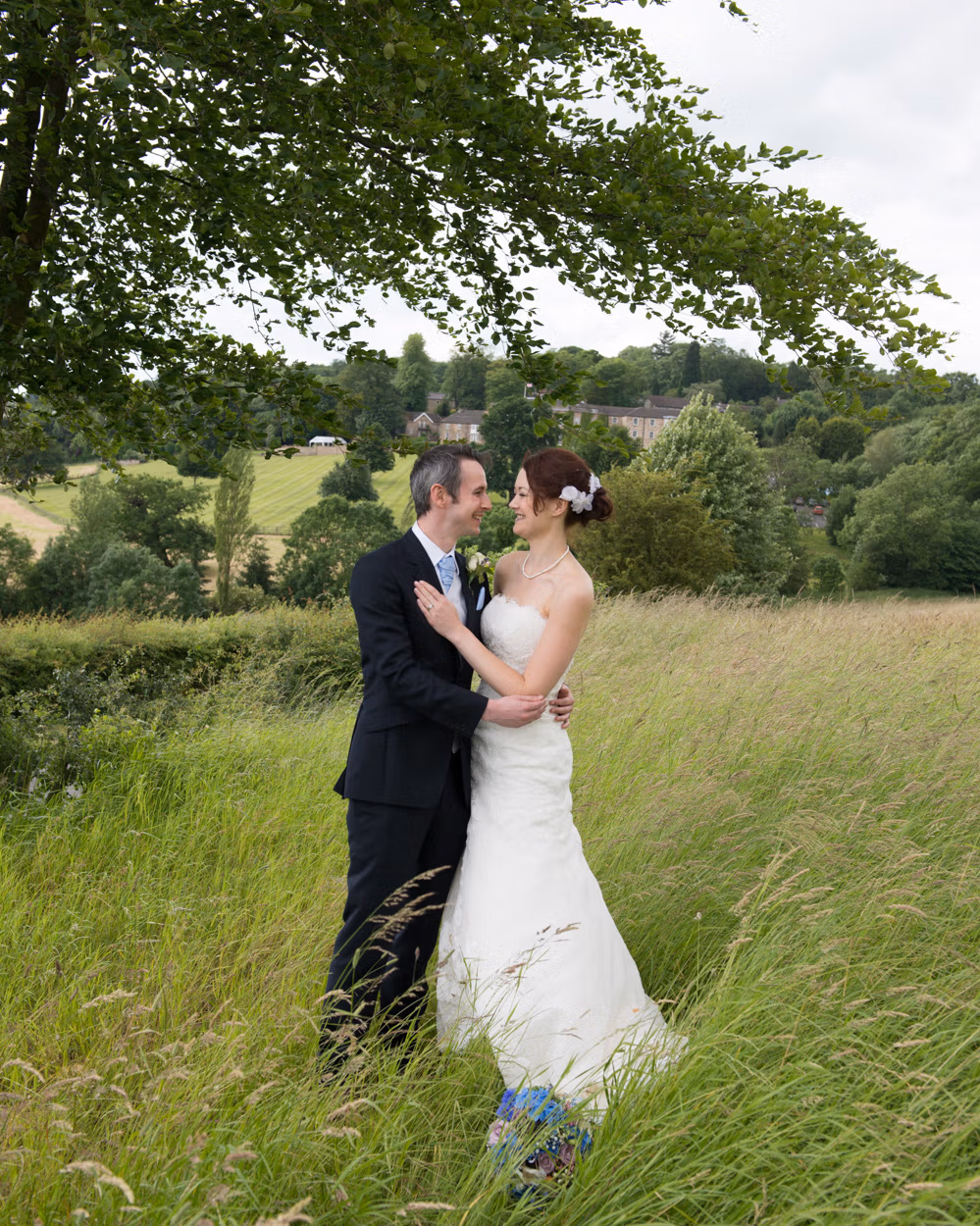 Their ceremony took place in an 11th-century church — emotive, sincere, and deeply felt. Afterwards, we drove back towards Wood Hall, pausing briefly along the way, the hall appearing softly in the distance as we stepped into the long grass for a few quiet portraits.