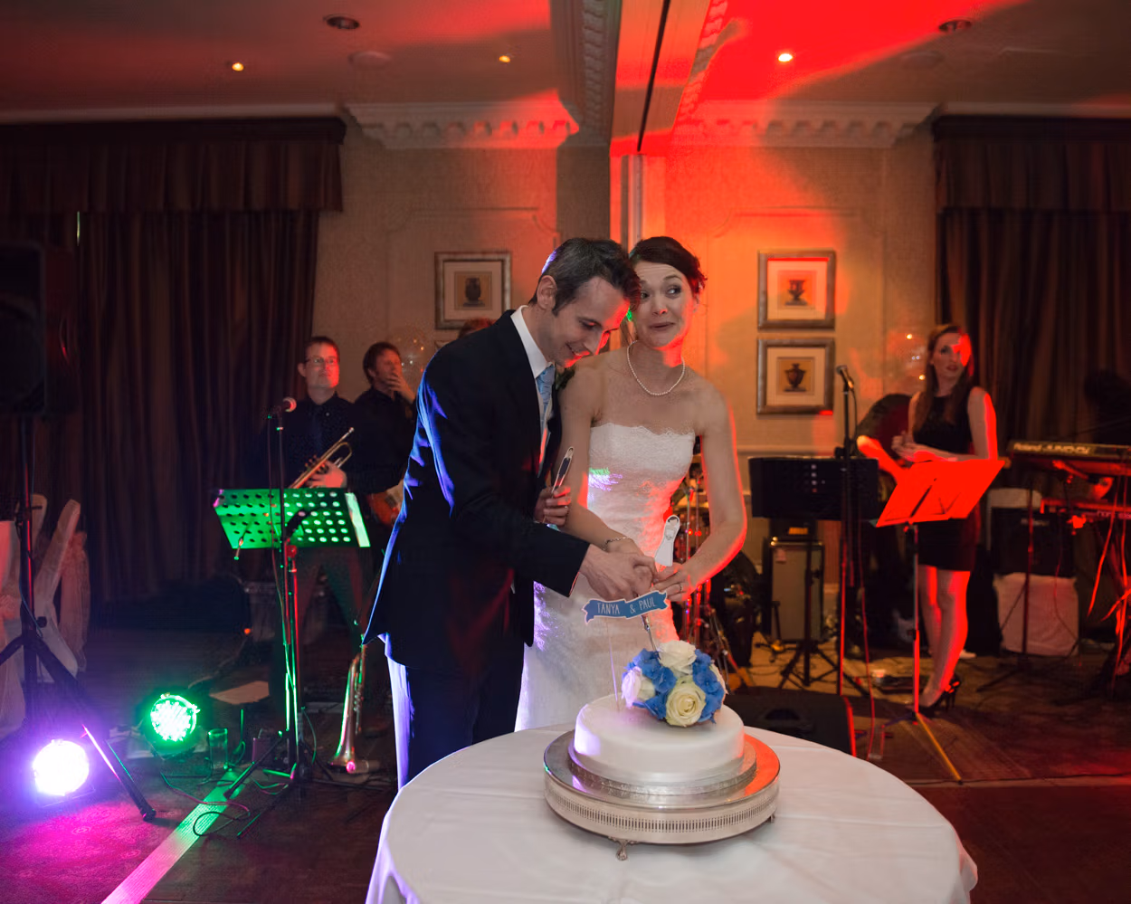 Back inside, evening settled gently through the rooms. The cake was cut without fuss, a small moment shared between them before the music began. Nearby, the soft glow of the jazz band carried through the space as guests gathered once more.