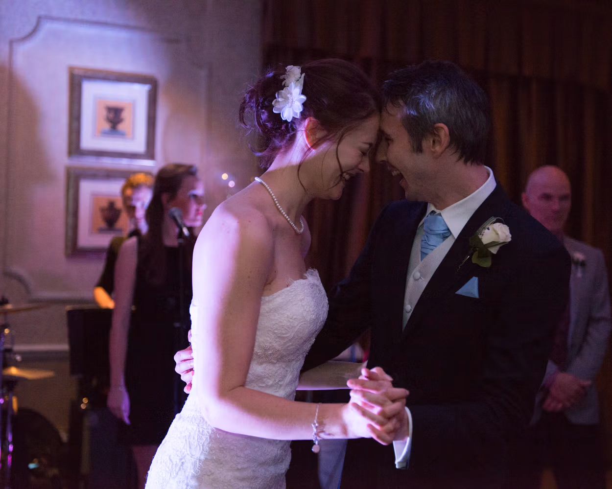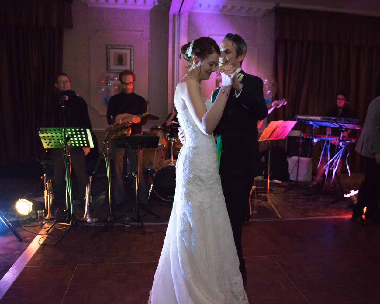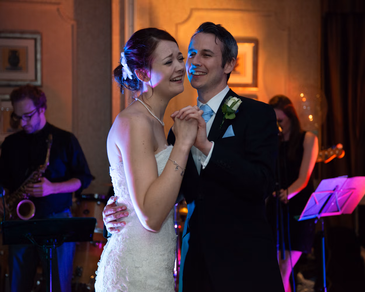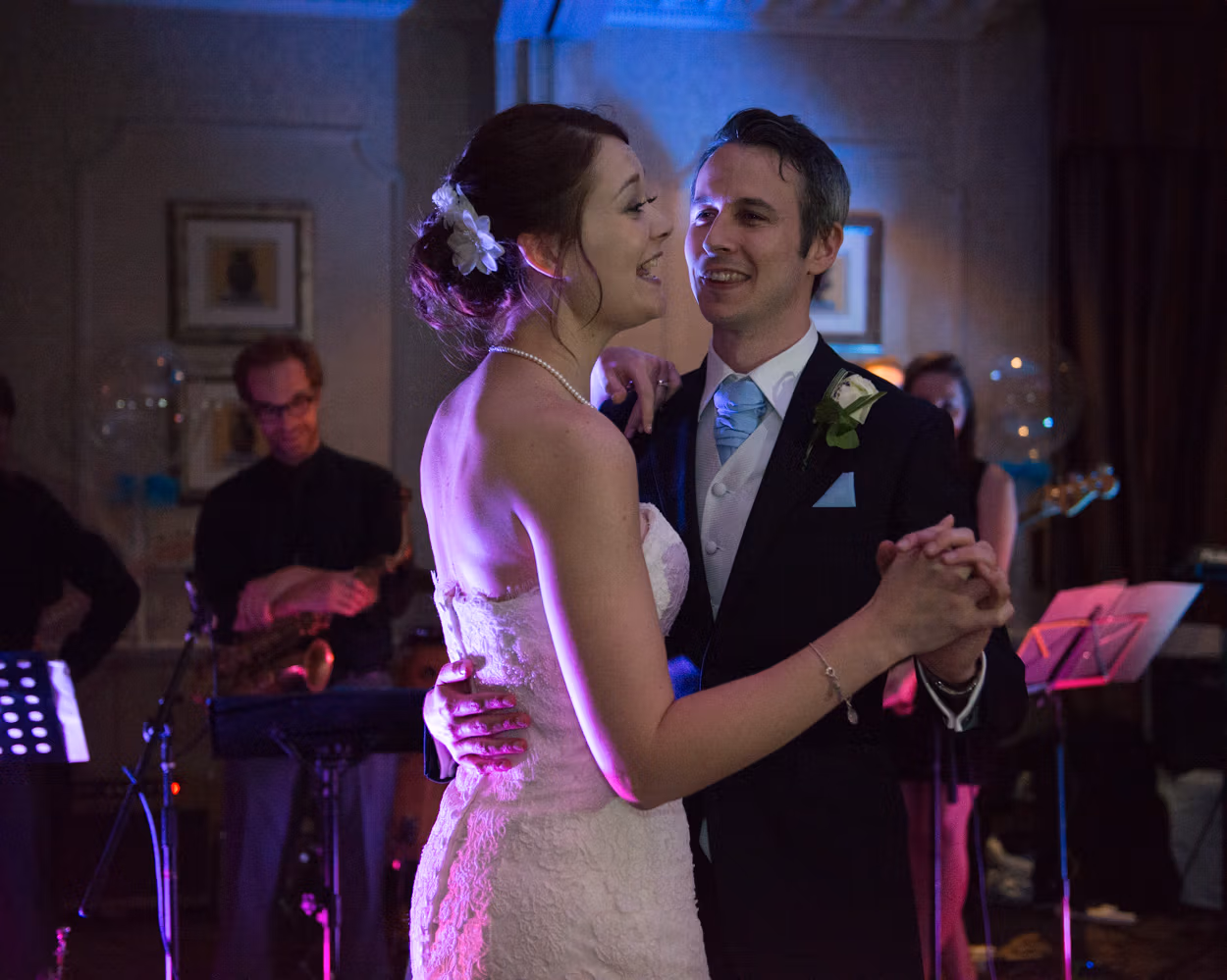 The wedding breakfast and speeches carried warmth into the early evening, followed by a first dance and the gentle rhythm of a jazz band that slowly lifted everything into motion.