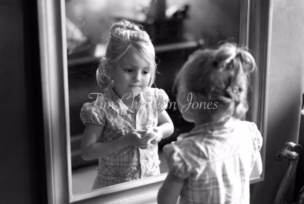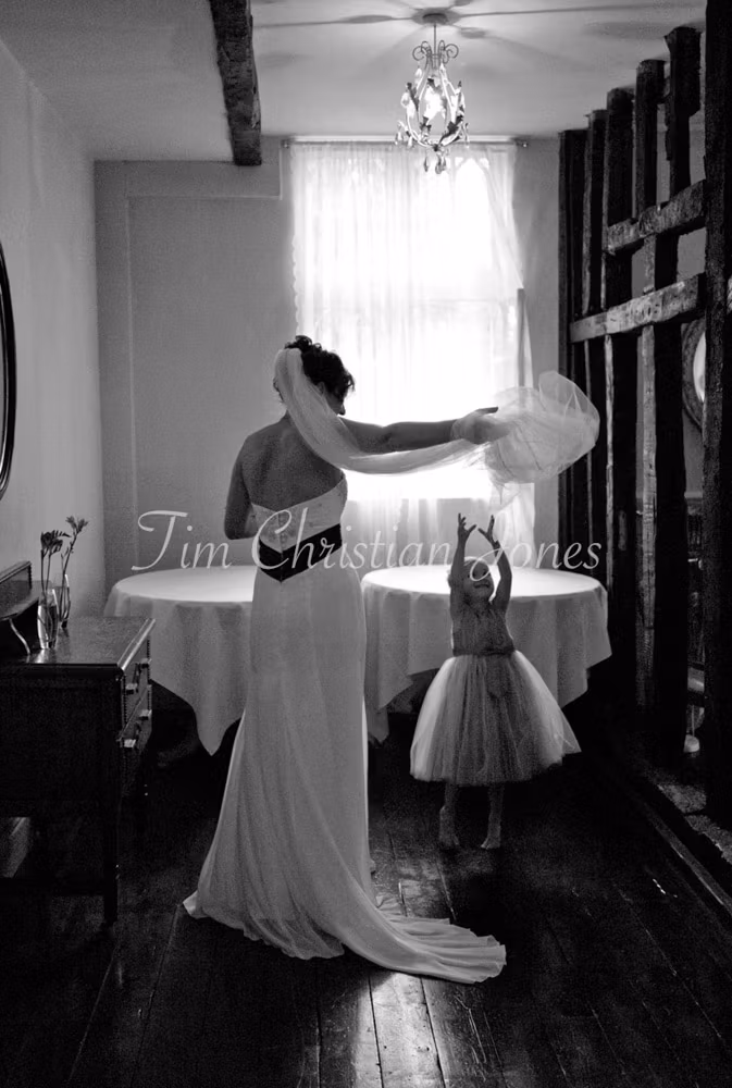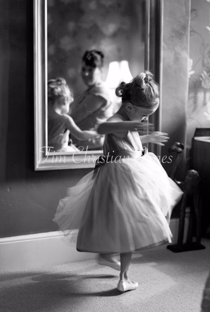 Julie and her young daughter shared time by the mirror in black and white, full of calm affection. Little stories bloomed around them — a playful leg kicked up against the pastel wall, makeup help from Julie’s sister, a tiny champagne toast, and a twirl caught in the glass. No fuss, just a room full of character, closeness, and quiet storytelling moments.